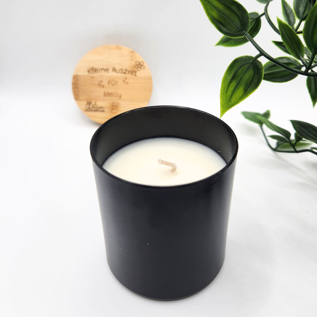 Schenke einen Moment der Ruhe im edlen Gewand. Jetzt Namen angeben und die schwarze Wellness-Kerze personalisieren!