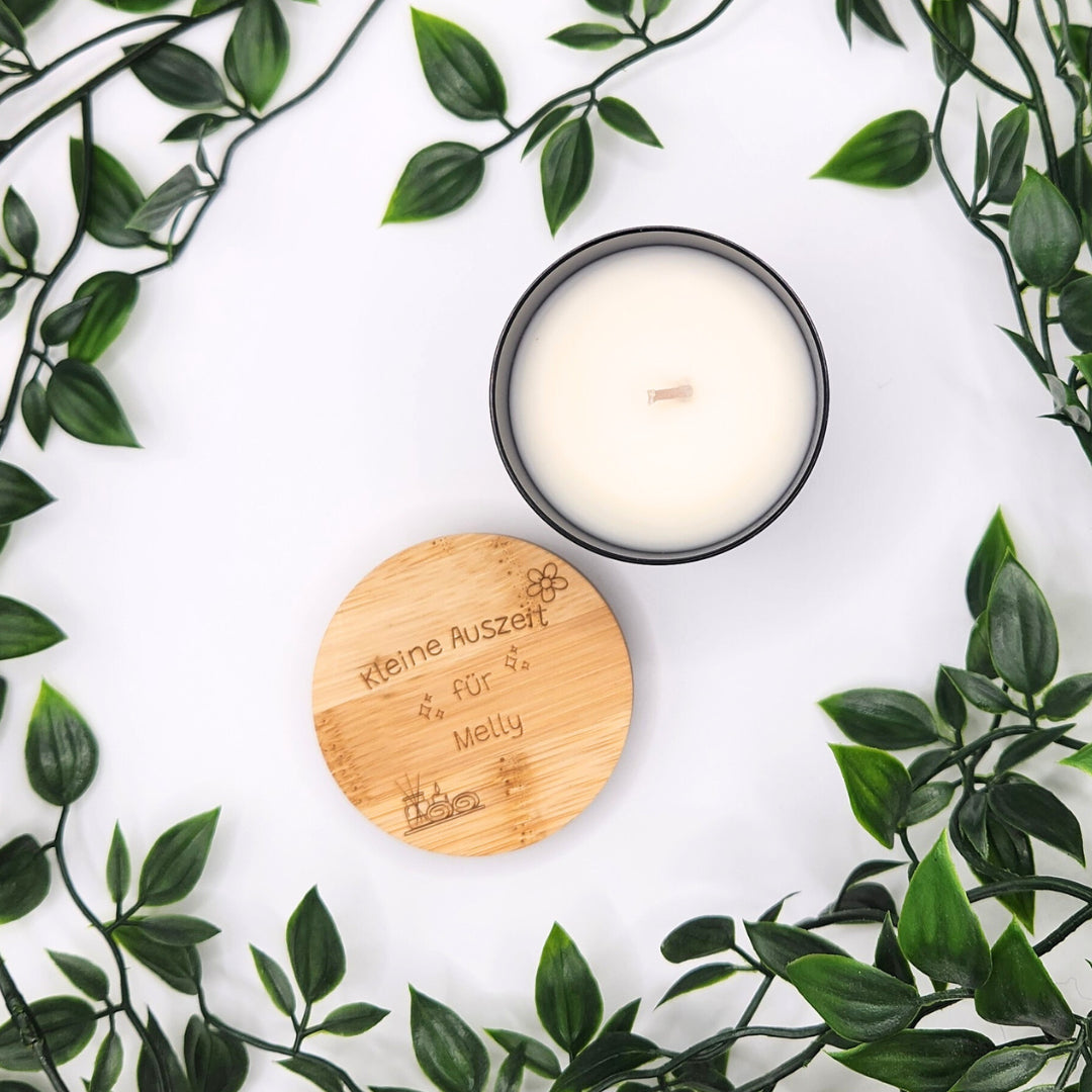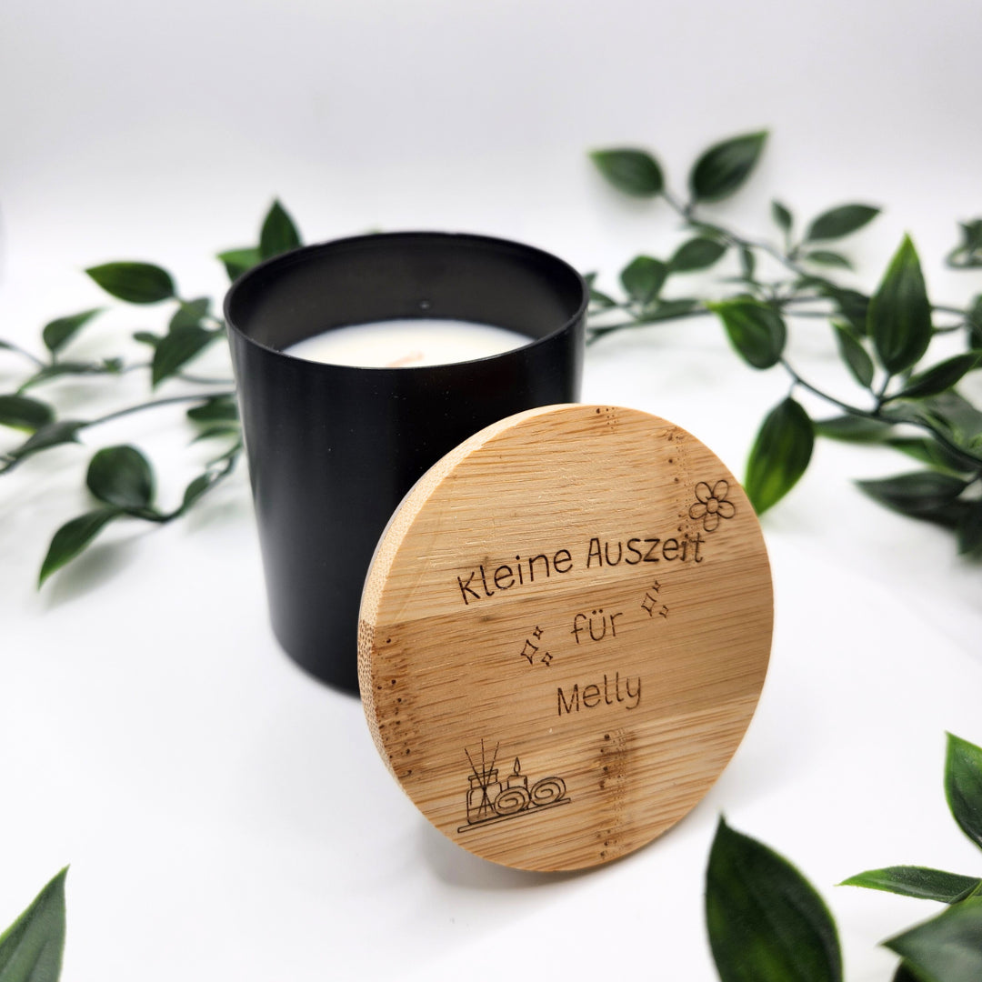 Diese Kerze ist mehr als nur Deko; sie ist eine Einladung, den Moment zu genießen. Wir veredeln den Bambusdeckel mit einer hochwertigen Lasergravur, die dauerhaft und präzise bleibt: