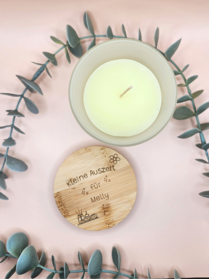 Diese personalisierte Duftkerze mit Vanilleduft und Bambusdeckel ist mehr als nur eine Kerze - sie ist ein individuelles Highlight für dein Zuhause oder ein liebevolles Geschenk. Der Bambusdeckel kann mit deiner Wunschgravur versehen werden und macht die Kerze so zu einem echten Unikat.