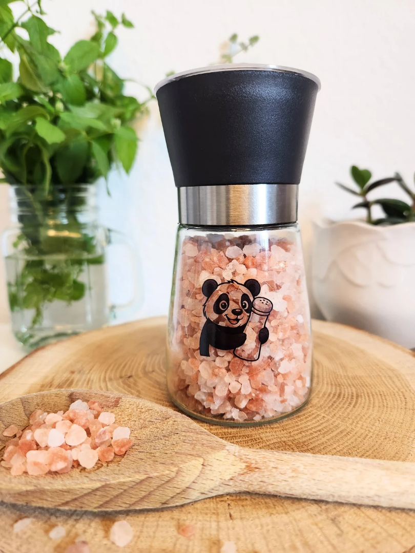 Diese Salzmühle mit 215 g Himalaya Salz ist nicht nur ein praktisches Küchenzubehör, sondern auch ein echter Hingucker. Das Besondere: Sie ist mit einem Panda Aufkleber verziert, der eine Salzmühle in der Hand hält - ein charmantes Detail, das sie einzigartig macht.